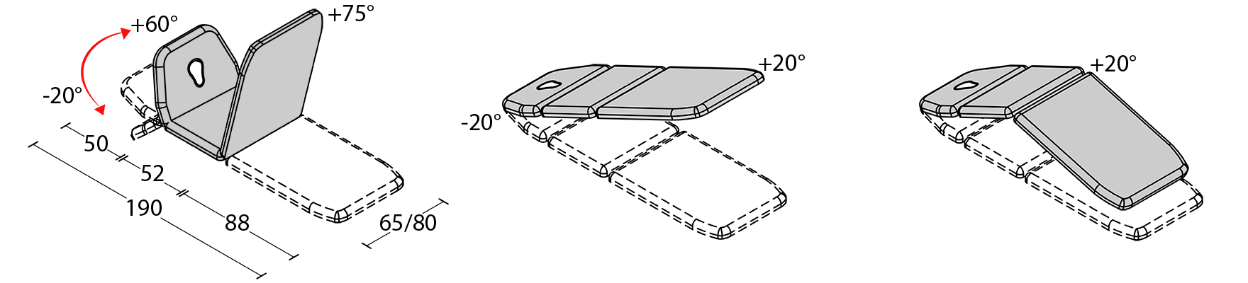 Lettino a tre sezioni regolabile elettricamente in altezza o mediante comando idraulico, per terapia, massaggi e visita medica. Il lettino si regola in altezza fino a 90 cm. Le sezioni sono regolabili mediante pistone a gas permettendo anche la posizione Trendelenburg.