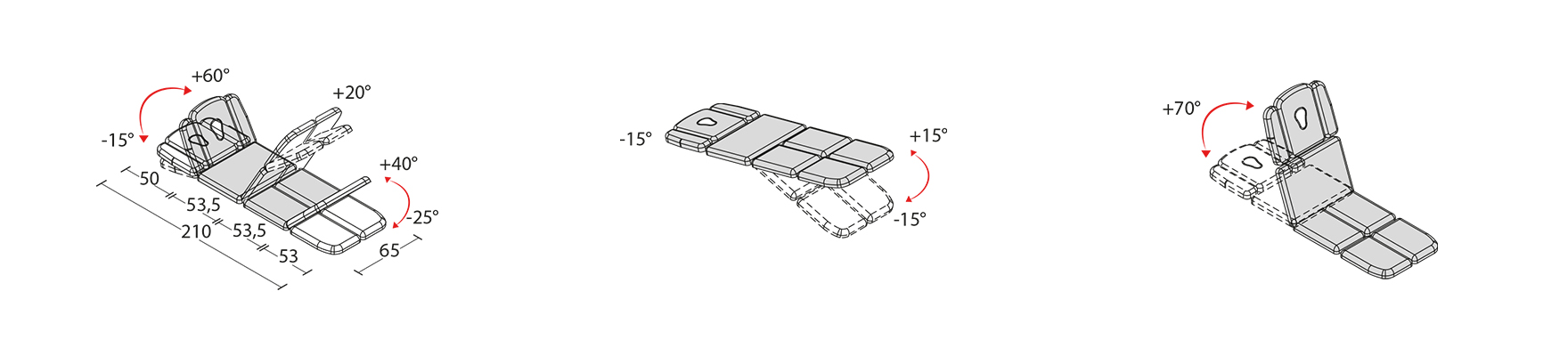 Lettino a otto sezioni con 2 motori per terapia, massaggi e visita medica. La sezione centrale è regolabile elettricamente. Le quattro pediere separate sono regolabili tramite molla a gas. Può assumere la posizione Trendelenburg e AntiTrendelenburg.